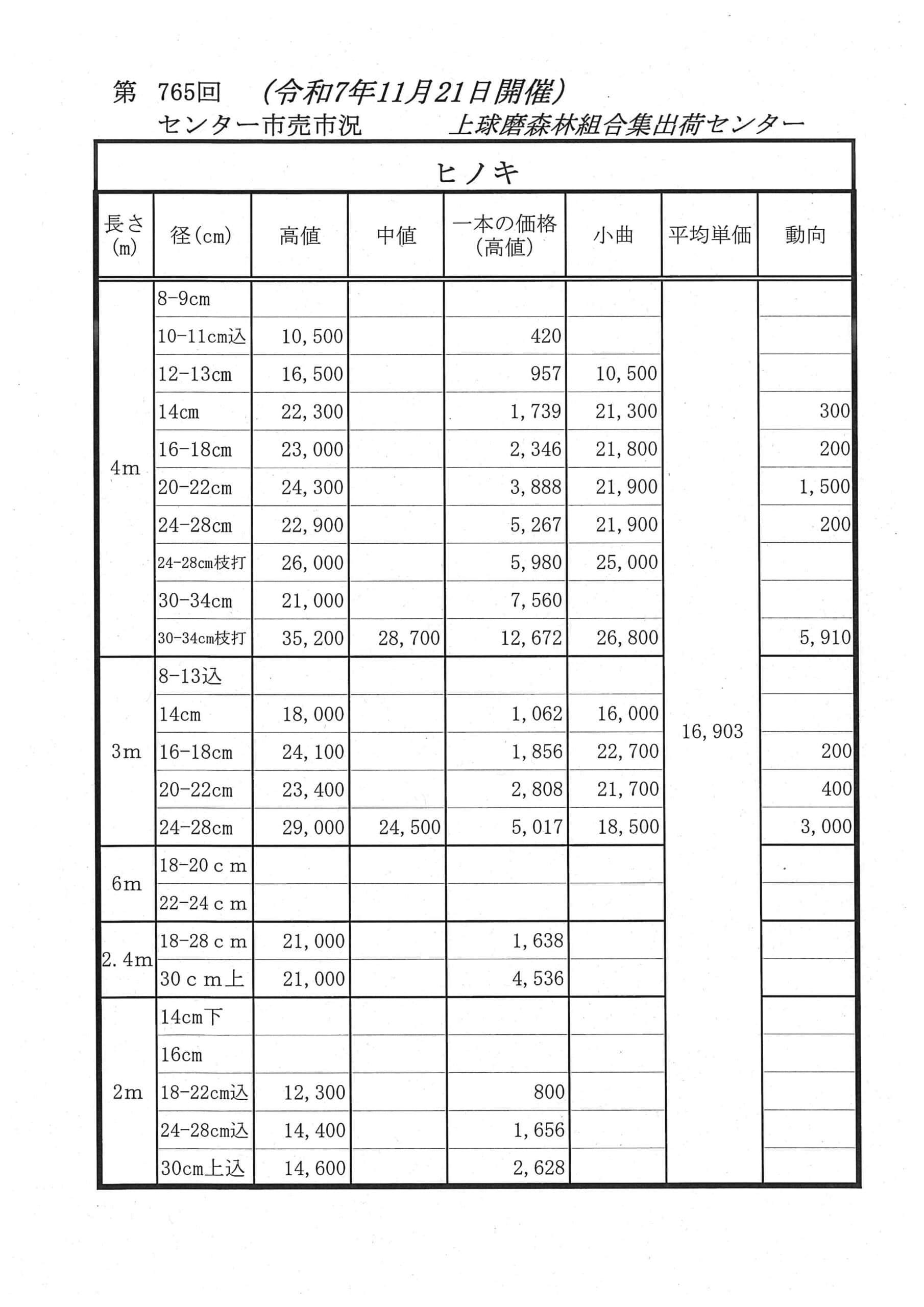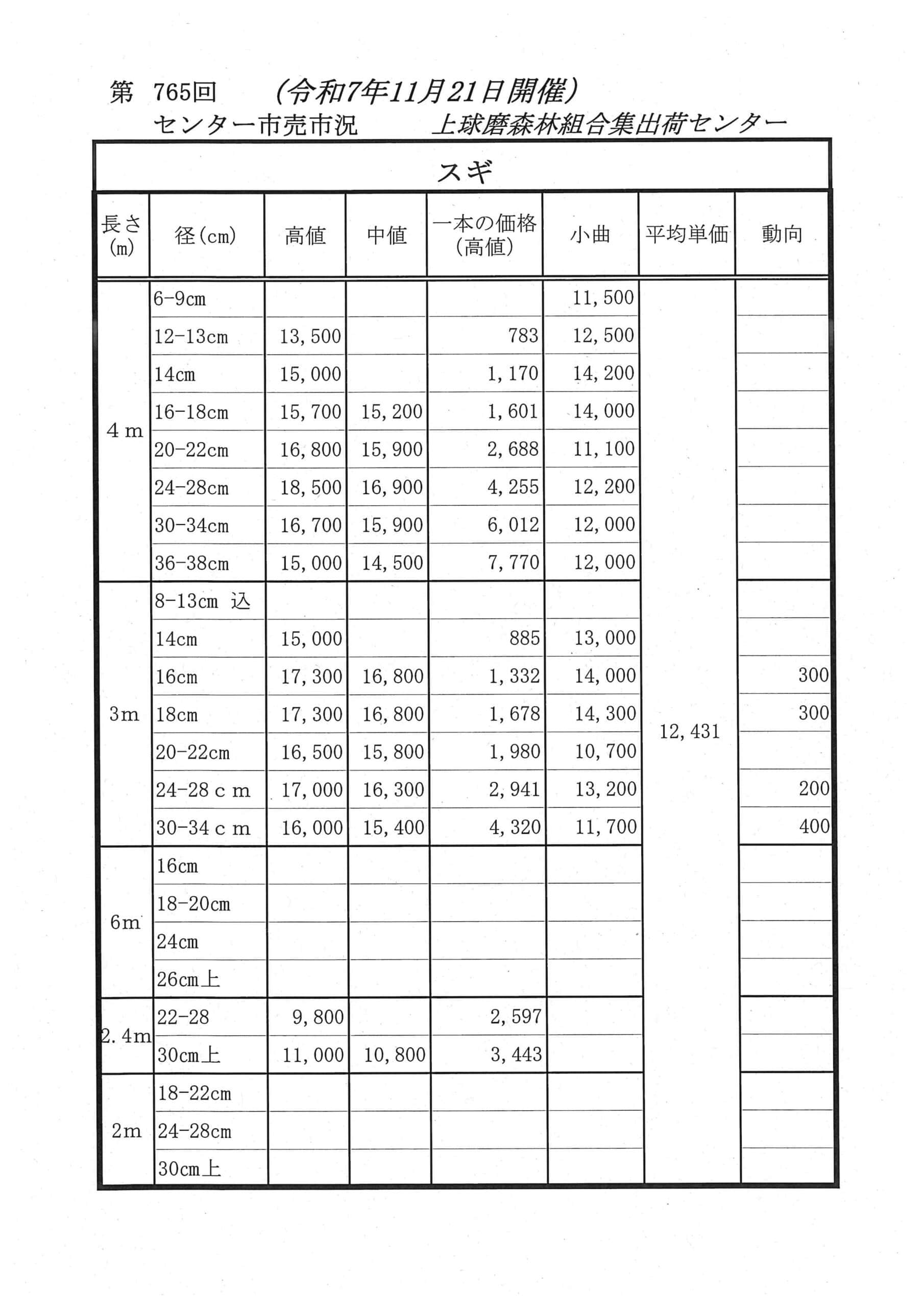 杉—–3mは柱材のやや曲が若干の値下げでほかは値上げまたは横ばいで取引 桧—–全体的に値上げでの取引、特に枝打材については高値 |